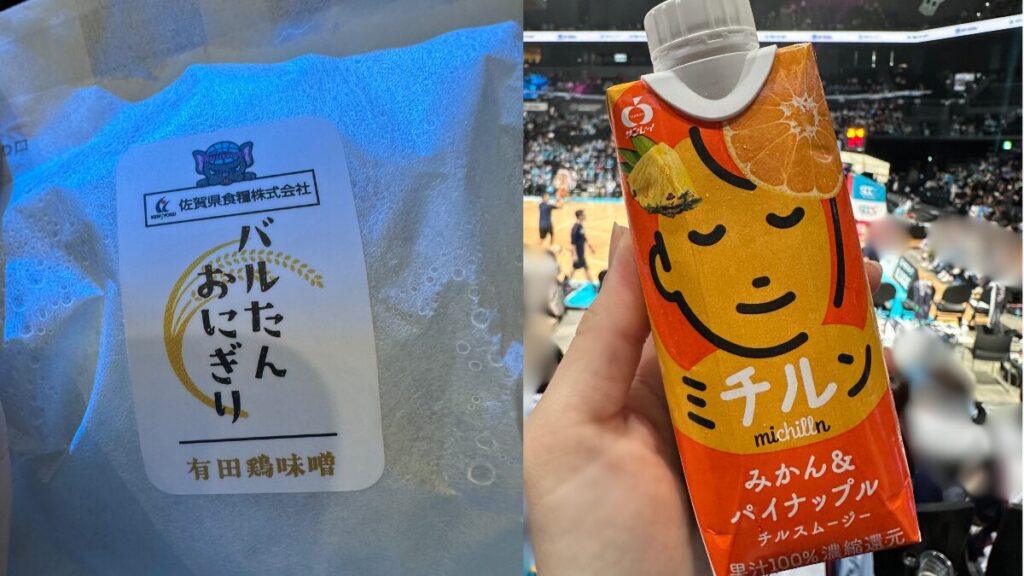 2025年12月観戦時には、アリーナ内の飲食店で「バルたんおにぎり(有田鶏味噌)」+「ミチルン(みかん&パイナップルチルスムージー)」を合わせて750円(税込)でいただきました。