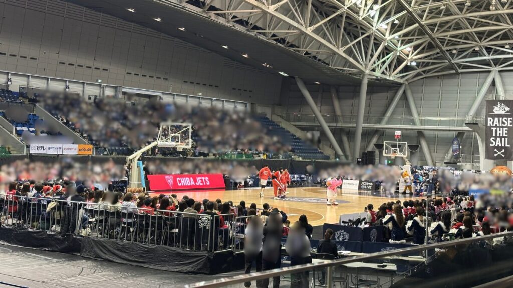 千葉ジェッツが対戦相手ということもあり、ビーコルファンはほとんど座っておらず、アウェイファンに囲まれていました。